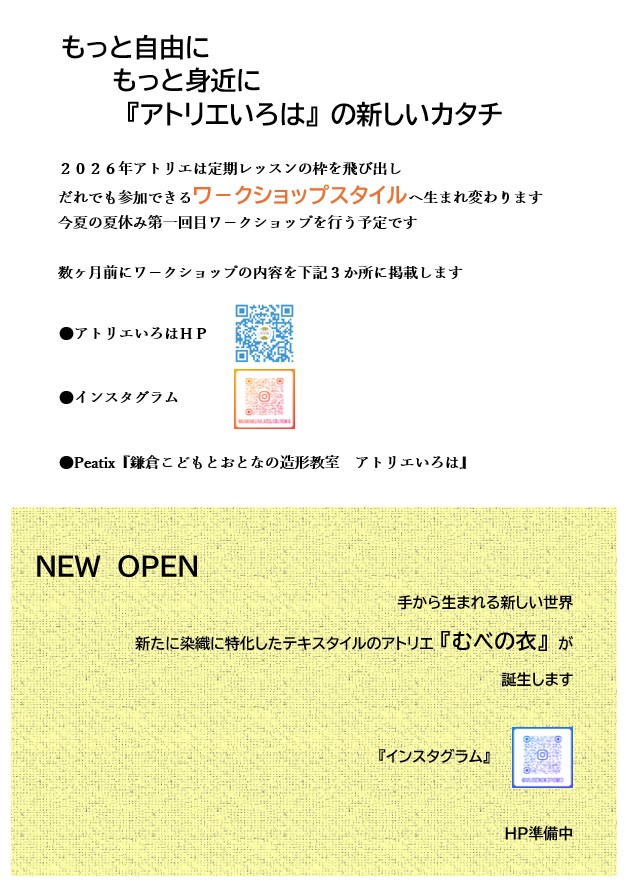 手をうごかし 時にはからだ全体をつかい 五感でかんじ 自分でかんがえ 形にしていく ゆっくりしたリズムを大切に 自分なりの表現を見つける喜びを 光のふりそそぐアトリエで 思いっきり心を解放し あなたの中の「つくる!!」を花開かせましょう 世界に一つだけの形を一緒に楽しんでいきましょう 明るくて開放感のある空間。 小さな図書コーナーもあります。 トントン カラリ、布をおることもできます。